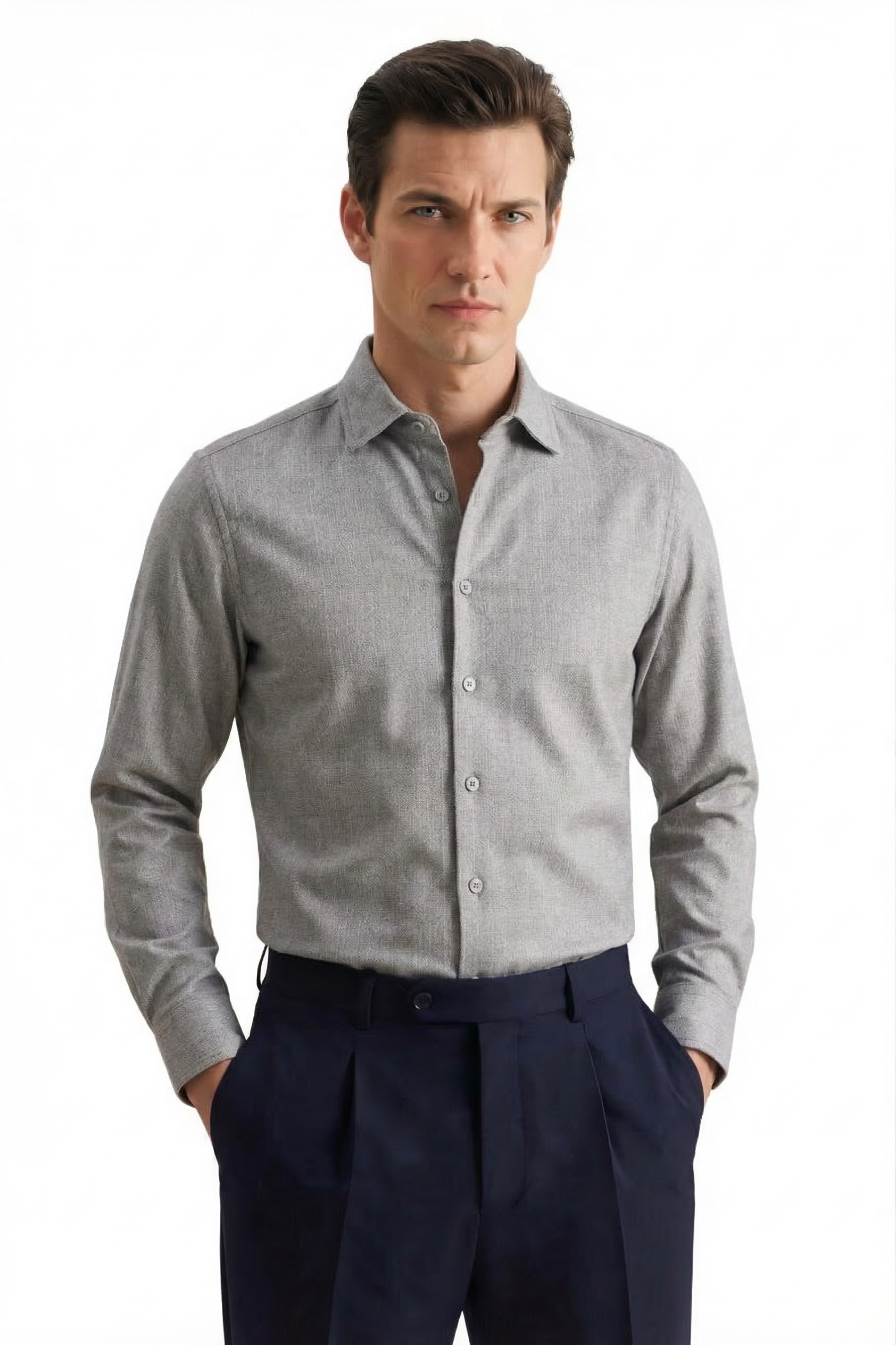 Универсальный цвет легко сочетается с джинсами, брюками и пиджаками, позволяя создавать современные образы. Рубашка полуприлегающего силуэта, не сковывает движения и выглядит аккуратно как навыпуск, так и заправленной. Длинный рукав и классический отложной воротник делают модель практичной и всесезонной. Застежка на пуговицы.